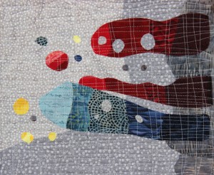 May 2010 17 1/4 x 17 1/4 This piece was made for the 2010 Fiber Art Fusion invitational exhibit Motus (Movement). My usual style would not accommodate the theme, so I wracked my brain until I came upon the idea of making an optical illusion. The drop shadow causes an unexpected shift. The eye expects it logically to be one way — and yet it moves — so as the eye attempts to shift from 2d to 3d, it appears that the pieces move. At this angle, the shift is from top to bottom; if the quilt is turned sideways, the shift is from left to right. Fiber Art Fusion: Motus, The Art Place, Marietta, GA September 2010